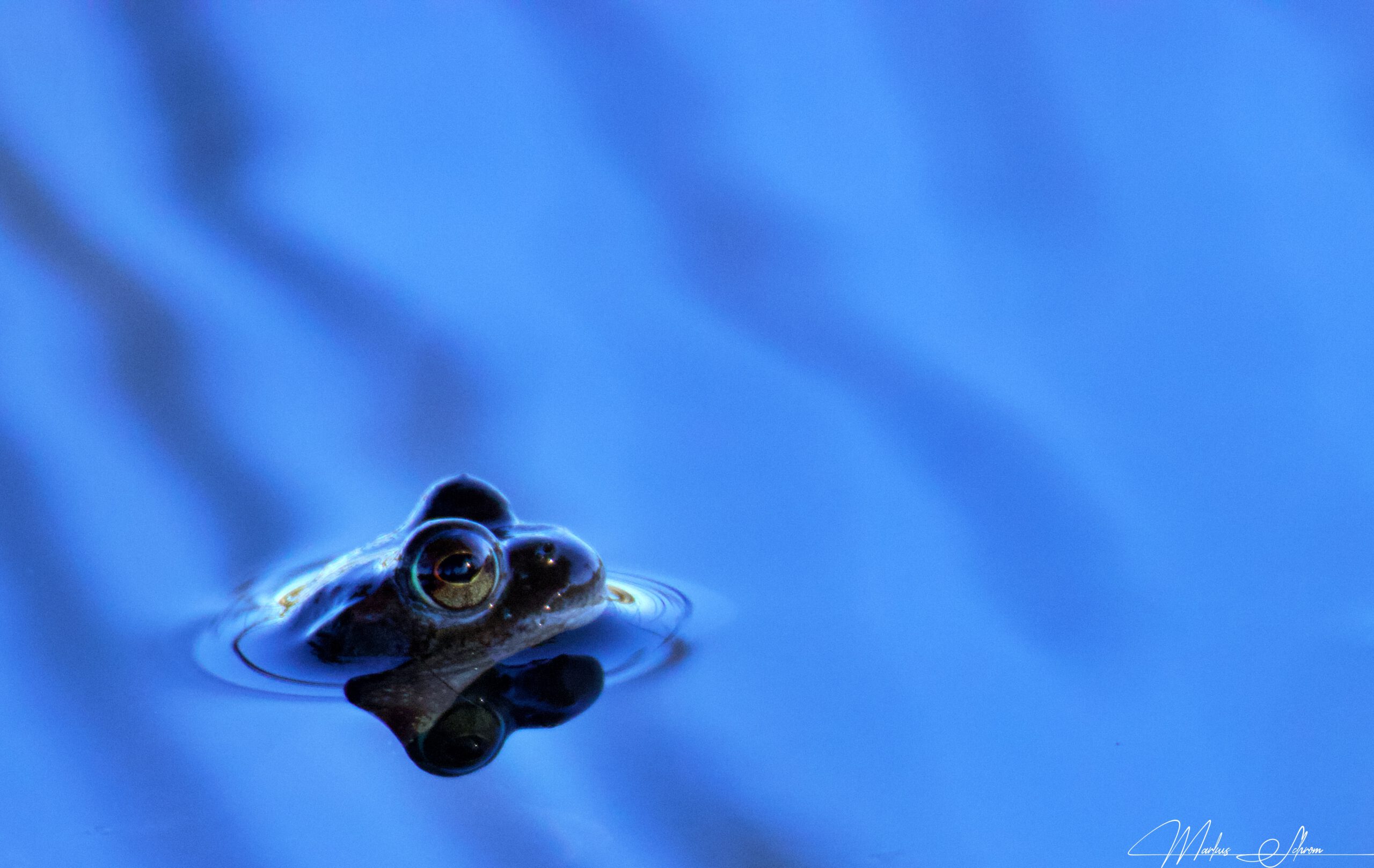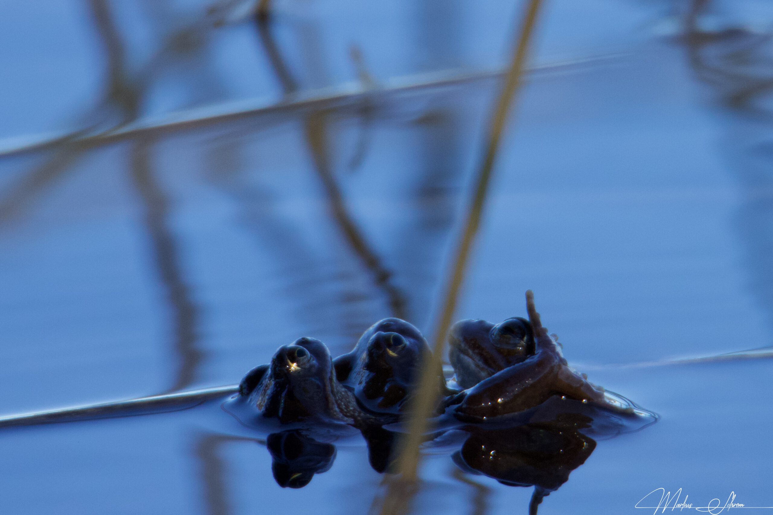 Durch Zufall und mit viel Geduld ist mir gelungen, am Kuhstallweiher bei Marktoberdorf eine Menge Grasfrösche beim Laichen zu beobachten. Ich finde es faszinierende Bilder. Da der Weiher windstill da lag, kann man sogar die Oberflächenspannung des Wassers sehen, die die Frösche umgibt.